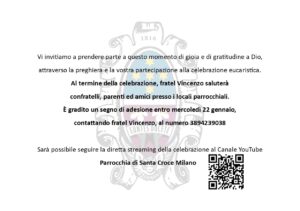 Al termine della celebrazione, fratel Vincenzo saluterà confratelli, parenti ed amici presso i locali parrocchiali. È gradito un segno di adesione entro mercoledì 22 gennaio, contattando fratel Vincenzo.