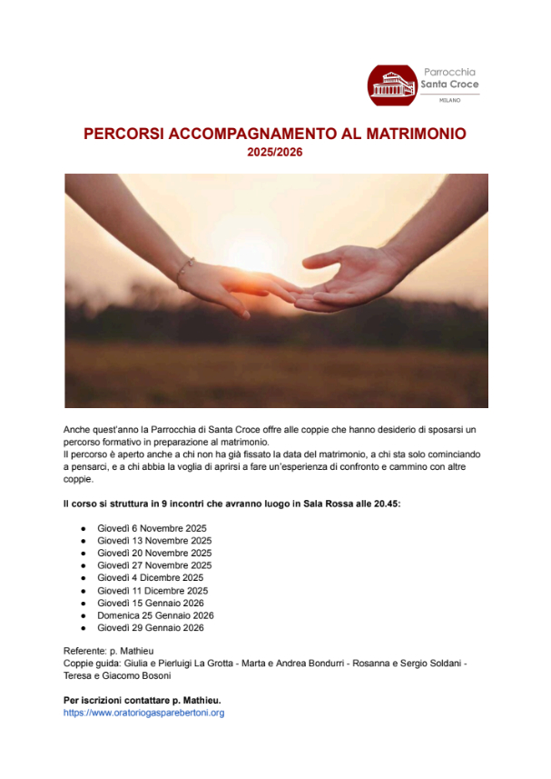 Anche quest’anno la Parrocchia di Santa Croce offre alle coppie che hanno desiderio di sposarsi un percorso formativo in preparazione al matrimonio.